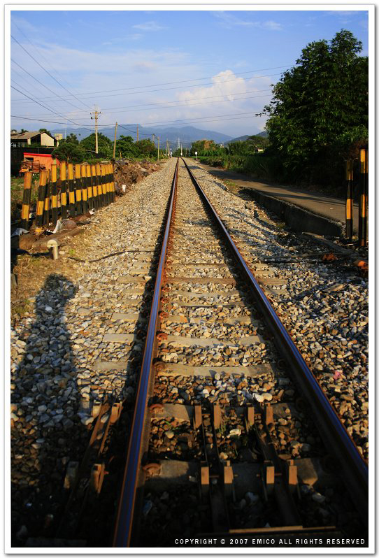夕陽照耀著我的背,在秋日的黃昏,顯得和煦溫暖。我向著東邊的山巒望去,喜歡這鐵軌的延伸感,似乎看見了盡頭,卻又有著不確定感。人與人之間,也是如此吧,總以為有交集,卻老是捉摸不定。除非,我們一起沿著鐵軌走下去。